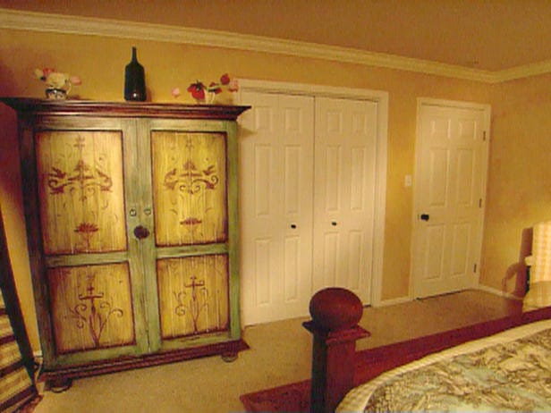 Chieko Kakihana and husband John Mundelius knew exactly what they wanted — French Country — and designer David Bromstad had only French doors to begin with. Using details like a wood encasement and painted furniture gave them a bedroom right at home in Provence.