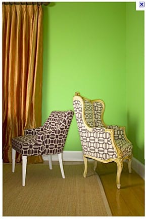 Jill Sorenson was featured in the Washington Post recently along with Chad Alan and Regan Ruiz, giving great design tips. The one below is one of the most clever ones I’ve seen (besides the wallpapered closet above). When using a pattern for upholstered chairs, you can reverse the pattern to heighten interest, as seen with these two chairs upholstered below with one Kelly Wearstler fabric. A great design tip from Marmalade Interiors.