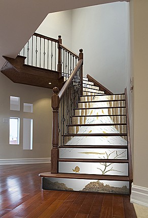 Wallcovering can be used on stair risers as a repeated design or a continuing design.