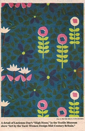 There is a new exhibit at the Textile Museum in Washington, DC, Art by the Yard: Women Design Mid-Century Britain. This is interesting to me because these retro designs of the late 1950’s – early 70’s have come back in style as something “modern” today.* What’s that saying, “Everything Old is New Again?” comes to mind. I’m eager to see the exhibit. Number 1) I didn’t know about the Textile Museum only the Renwick and number 2) some of these designs are pretty cool, like these shown below.
