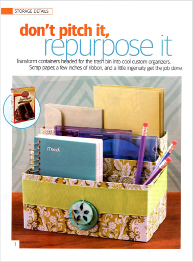 I saw a neat recycling idea for using Casart Wallfinishes removable wallpaper that I just had to share with you. Don’t throw away that empty cake mix box or coffee can. Here’s the idea from the Fall/ Winter 2009 Better Homes and Gardens Storage issue.