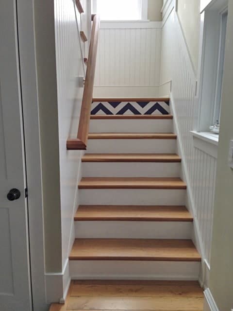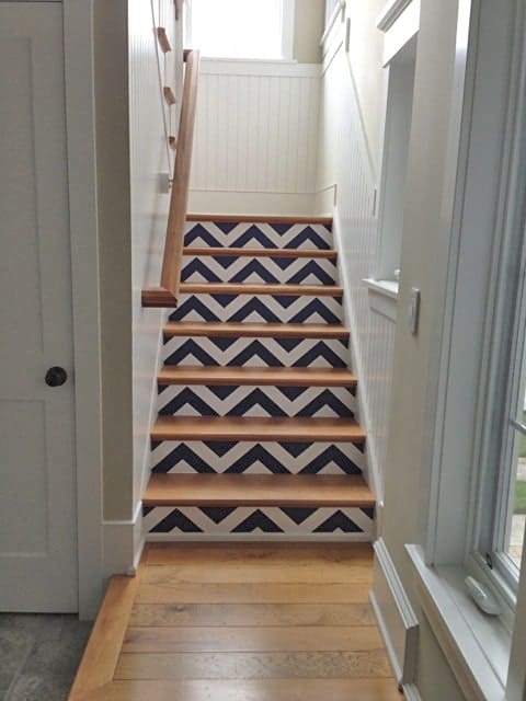 Libby Langdon Chevron uplifts stairs. This pattern in Midnight Navy  that  Interior designer Susan Dudzinsky used adds punch and geometric power to these otherwise unnoticeable stairs, as seen in the before picture below.